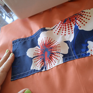 Aproveché el forro de un bolsillo interior lateral que tenía un ribete de tela de piñas y sobre él coloqué otro retal de piñas que ya estaba rematado, así que me ahorré algunos pasos.