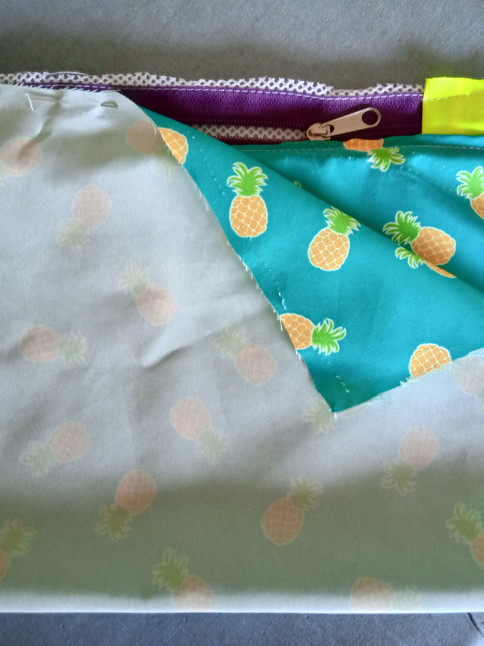 Para el NECESER DE PIÑAS, utilicé un retal de llamativo amarillo flúor; para el NECESER AZUL utilicé la misma tela que usé para el forro, que era la parte trasera de una bolsa-mochila de publicidad.